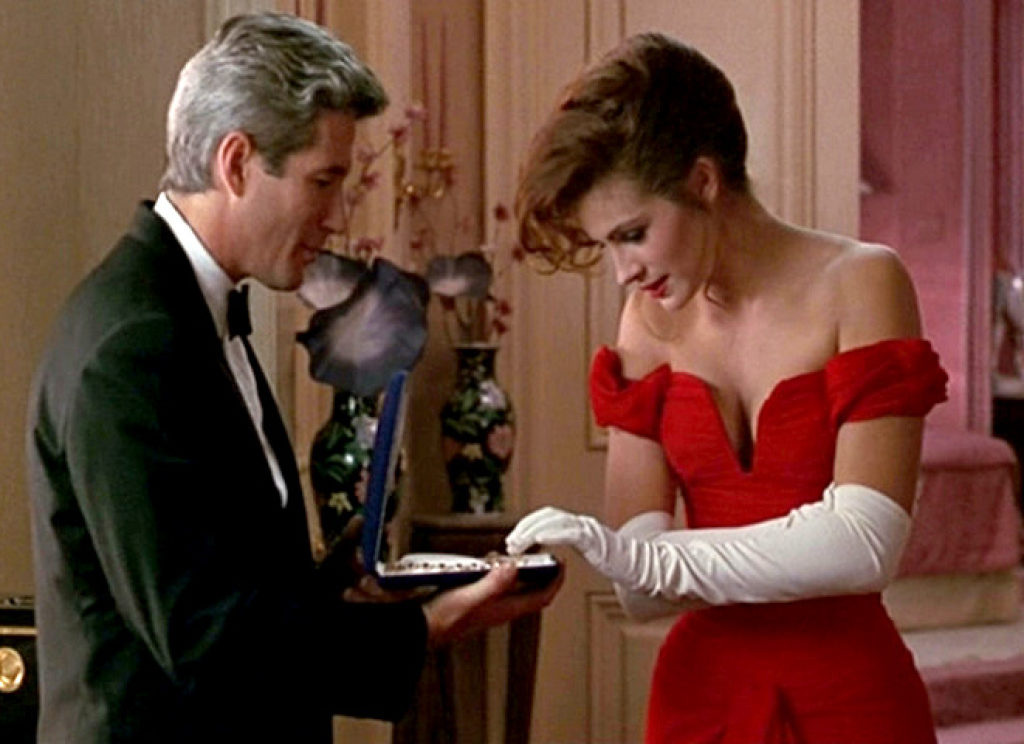 En una escena de la cinta, Richard Gere le regala a Julia un collar de brillantes. Pero cuando ella está a punto de tomarlo, el actor cierra la caja como broma, a lo que la actriz reaccionó con una risa explosiva y muy espontánea. Al final, esa broma se conservó en el original, pues se consideró que iba de acuerdo a la situación.
