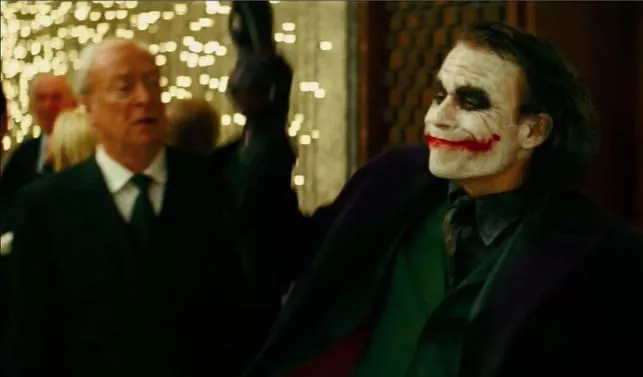 De acuerdo al guión original, cuando el Guasón irrumpe en la fiesta Díaz, Alfred lo debía de encarar y pedirle que se retirara, pero Michael Caine sólo había visto a Ledger caracterizado de lejos, y ya cerca de él, y con su reacción lunática, simplemente se quedó petrificado, y no pudo reaccionar. Nolan decidió conservar ese escena, pues se veía mucho más real.